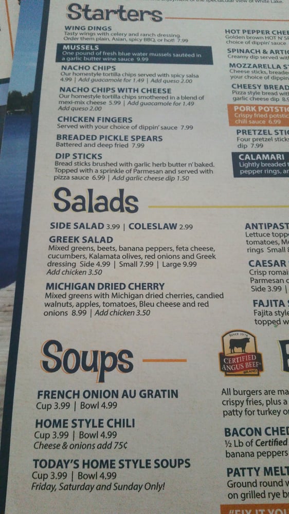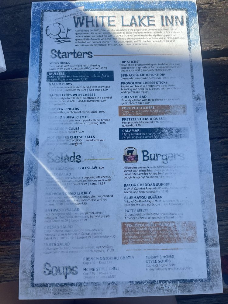The White Lake Inn is a dive bar located in White Lake, Michigan, offering a variety of dishes ranging from salads to burgers. This cozy spot is perfect for groups, kids, and even offers live music for entertainment. The menu includes starters like Wing Dings, Mussels, and Nacho Chips, as well as delicious salads such as Michigan Dried Cherry and Antipasto Salad. The soups, like French Onion au Gratin and Home Style Chili, are also popular choices. Customers rave about the great food and service, with mentions of delicious burgers, nachos, fish & chips, and pizza. The friendly staff, picturesque lake views, and unique boat-themed atmosphere make dining at The White Lake Inn a memorable experience. Don't miss out on the diverse menu and inviting ambiance at this must-visit spot.