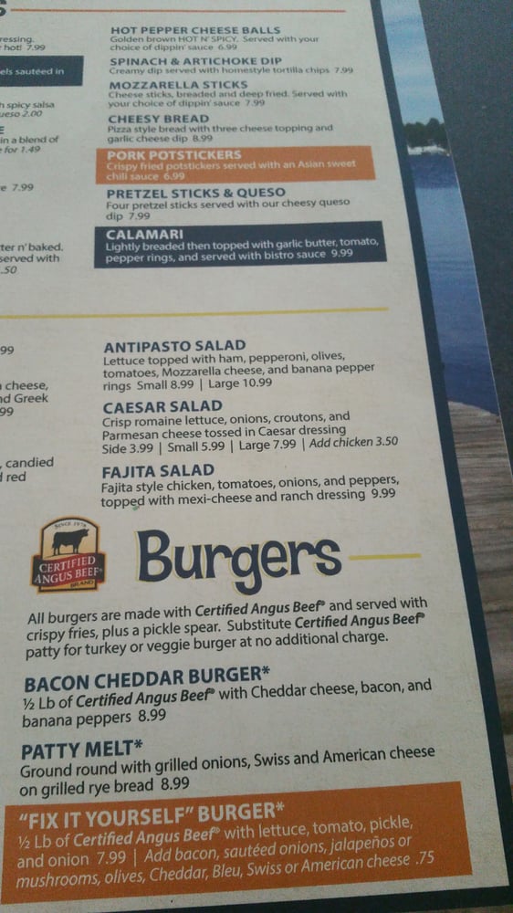 Lb of Certified Angus Beef with lettuce, tomato, pickle and onion. Add: bacon, sautéed onions, jalapeños or mushrooms, olives, Cheddar, Bleu, Swiss or American cheese